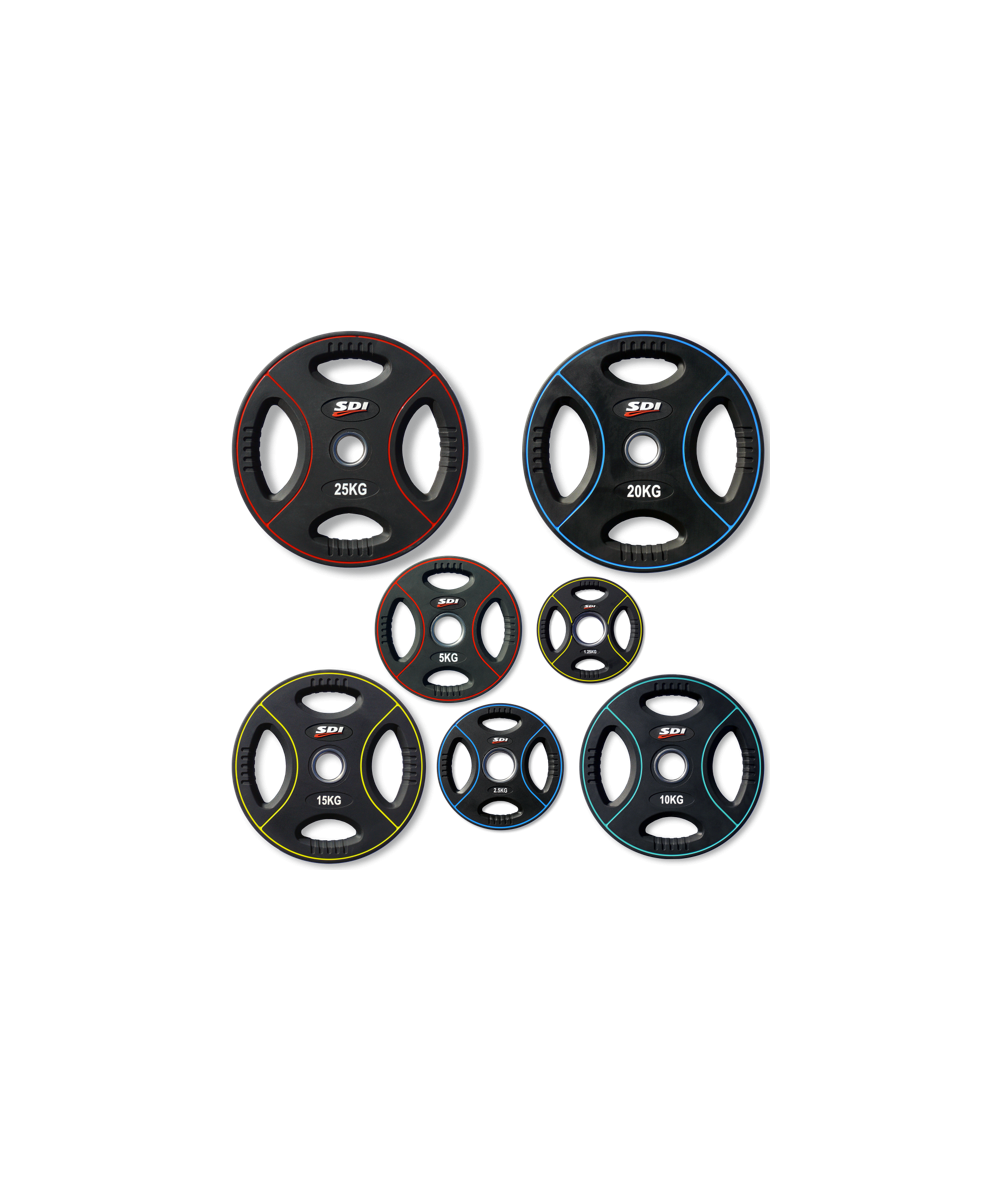 Le TPU (polyuréthane thermoplastique) est un plastique spécial qui protège les disques de musculation à un degré spécial et contribue ainsi à les rendre particulièrement durables: